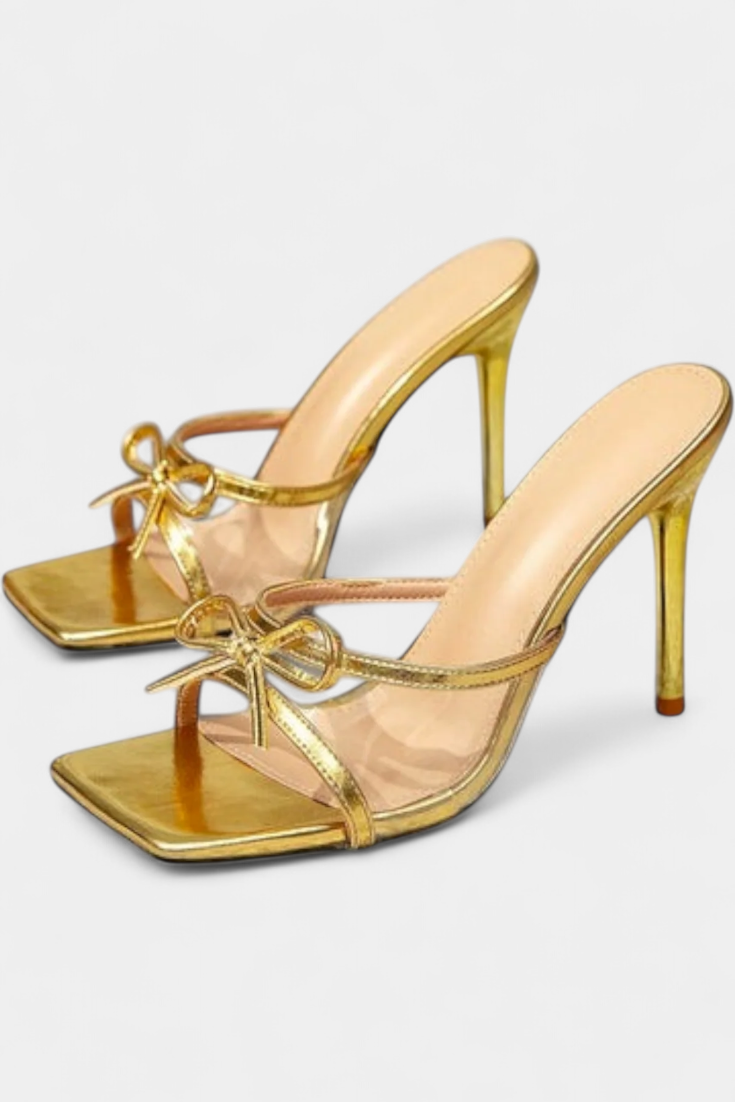 Brenda Stiletto Heels Featuring a Metallic Bow and Contemporary Patchwork Design