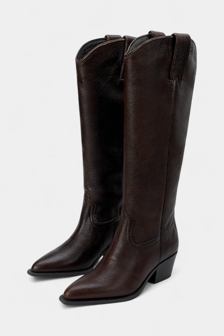 Icelle Brown Leather Equestrian Boots with Pointed Toe and Low Heel Design