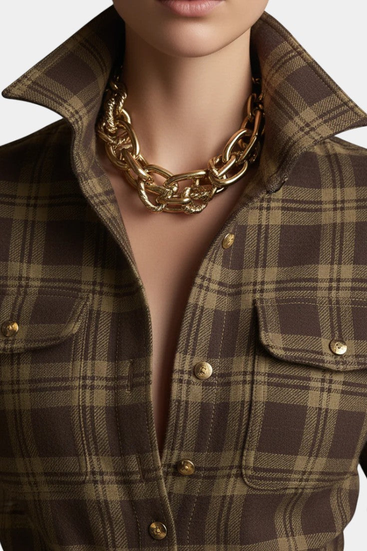 Discover the Eustellia Dress - a stunning blend of retro charm and ethnic accents. Featuring a warm reddish-brown checkered pattern, this dress is designed with a structured lapel collar and a flowing belted cut that enhances your silhouette with balance and ease.