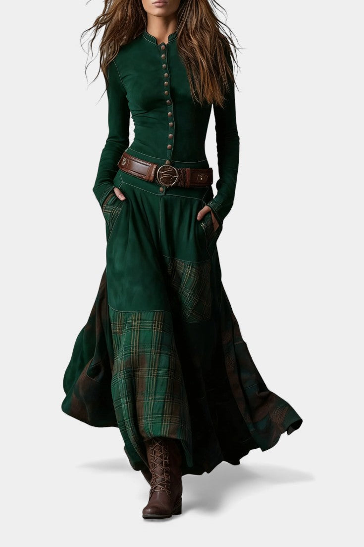 Timeless Elegance: The Marlis dress features eco-friendly suede and a unique checkered patchwork for a vintage-inspired look.