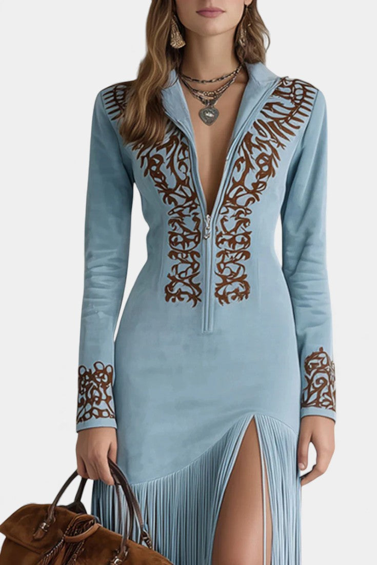 Embroidered Synthetic Suede Lieselotte Maxi Dress with Zippered Collar