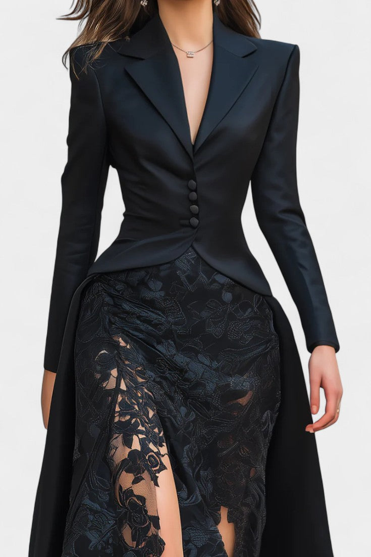 Flavienne: A stunning fusion of tailored power and delicate lace. This exquisite piece features a fitted blazer-inspired bodice that accentuates the waist, flowing into a breathtaking floor-length lace skirt. The striking contrast between the structured top and the romantic, fluid bottom creates an elegant silhouette that exudes confidence.
