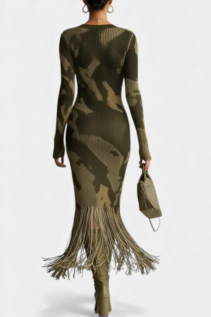 Fitted and Expressive: The Neele dress showcases a textured fabric adorned with olive camouflage patterns, making it a modern piece with a strong character.