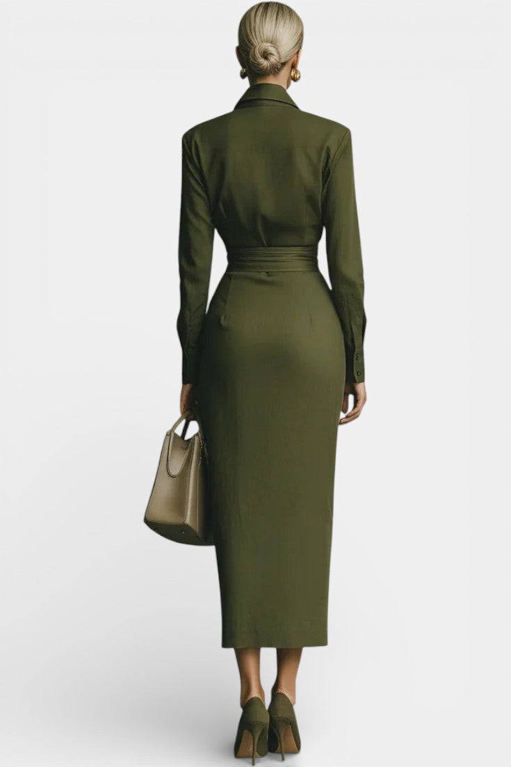 Discover the perfect blend of mastered elegance and contemporary style with the Séraphine Dress. Its deep army green hue and fitted cut create a striking silhouette, while the subtle draping adds a touch of sophistication.