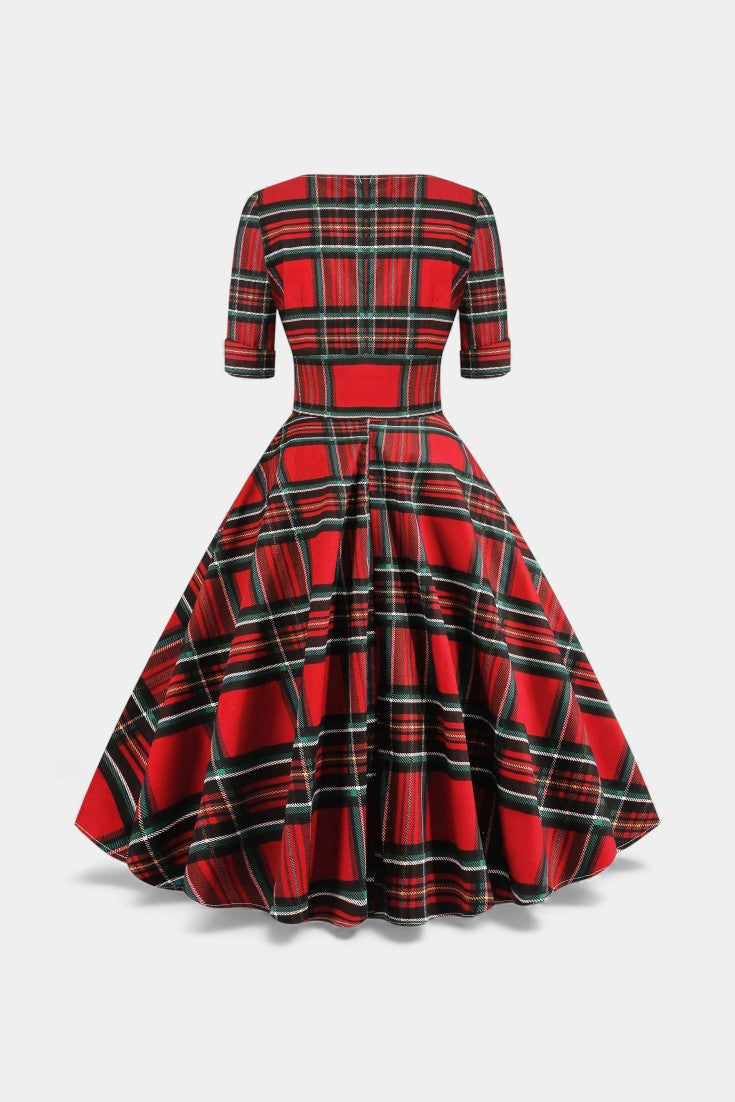 Véra Plaid Print Midi Flared Dress with Elegant V-Neck