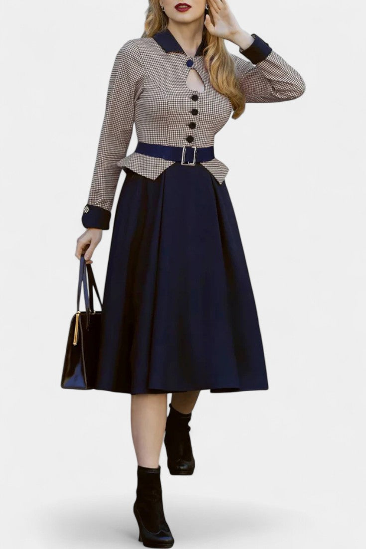 Natacha Checkered Midi Dress with Flared Hem, Collar, and Bow Detail
