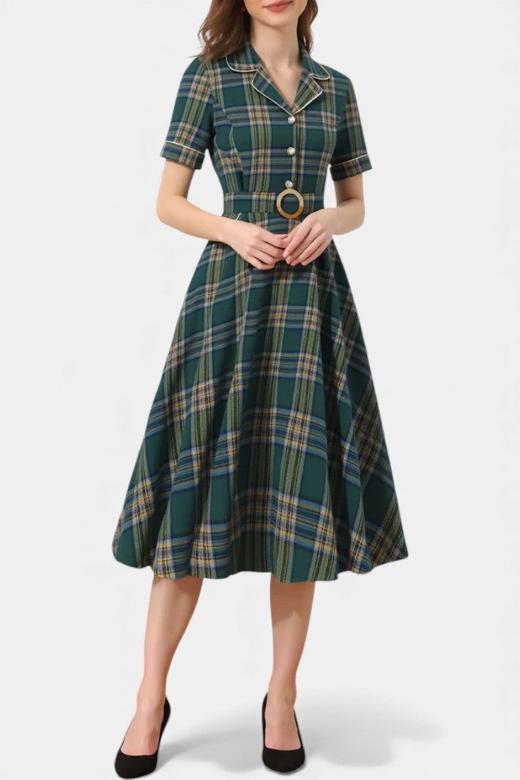 Lylas Vintage-Inspired Check Midi Dress with Tailored Collar, Pockets, and Belt