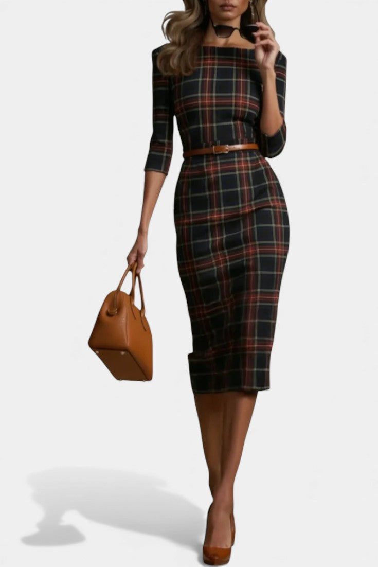 Axelle Checkered Midi Dress with Three-Quarter Sleeves