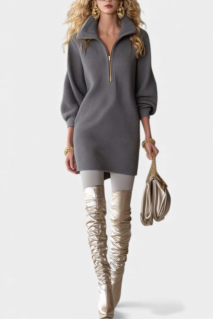 Glafira Mini Grey Dress with Zip Collar and Flared Sleeves