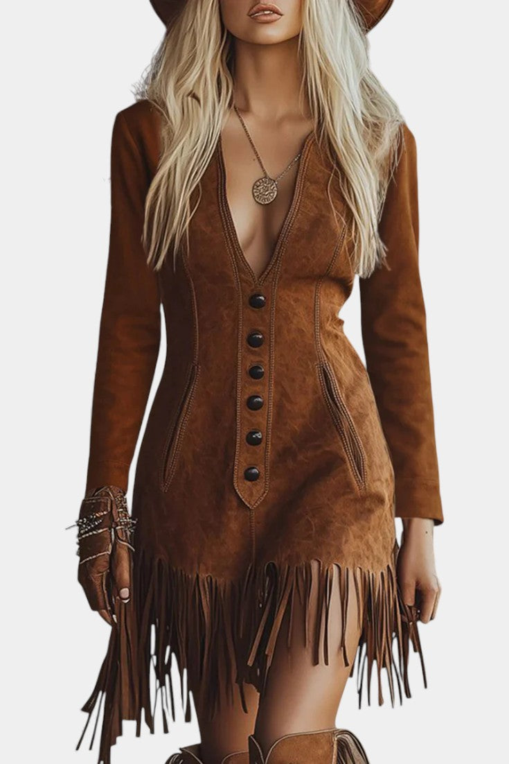 Erminia Long Brown Suede Dress with Sleeves and Western Fringe Details