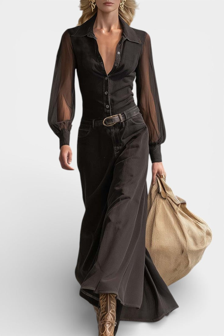 Black Denim Long Sleeve Button-Up Dress