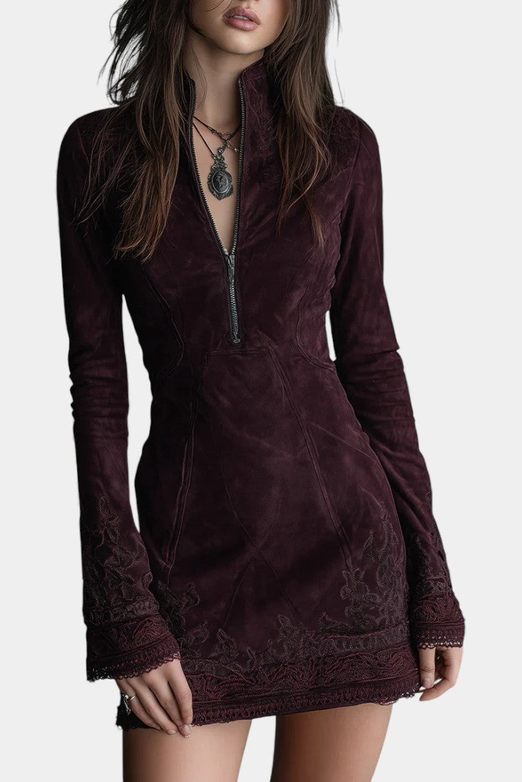 Vintage-Inspired Petronille Mini Dress in Dark Purple Suede with Embroidery and Lace Details