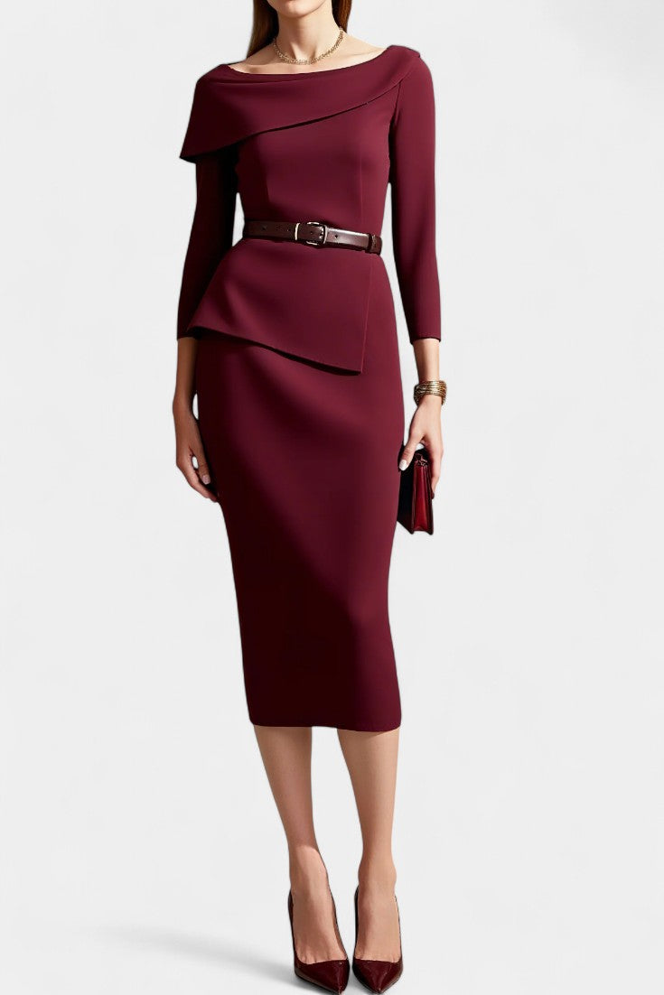 Lucie Long Sleeve Midi Dress with Pleats and Belt