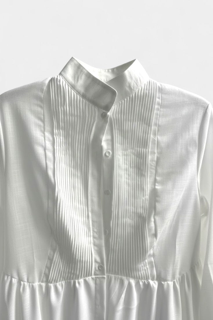 Introducing Marilou: A long and sleek piece that embodies refined simplicity. This elegant garment features a graceful high collar, subtle patchwork design, and a buttoned front that beautifully structures your silhouette.