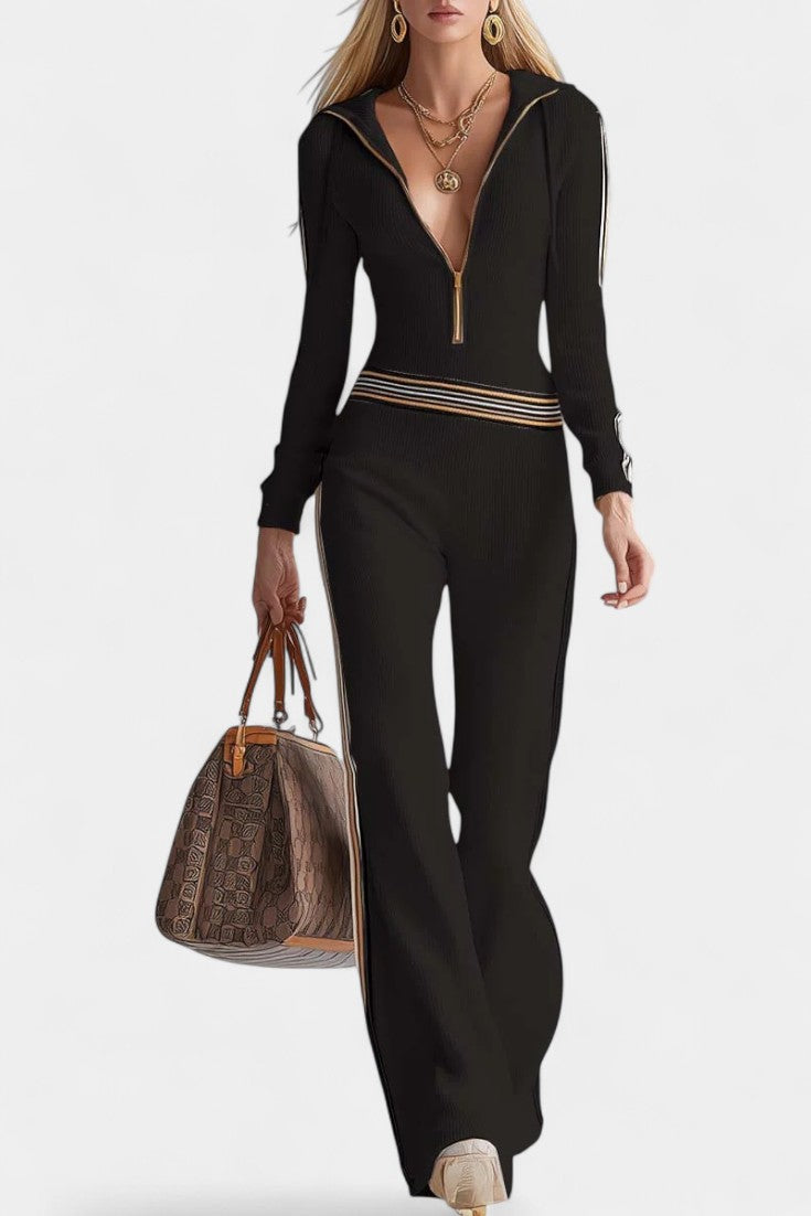 Angélise Hooded Jumpsuit reinterprets retro spirit with a sporty and modern touch. Crafted from soft and breathable knit, this jumpsuit features a charming zippered V-neck and contrast stripes at the waist and cuffs.