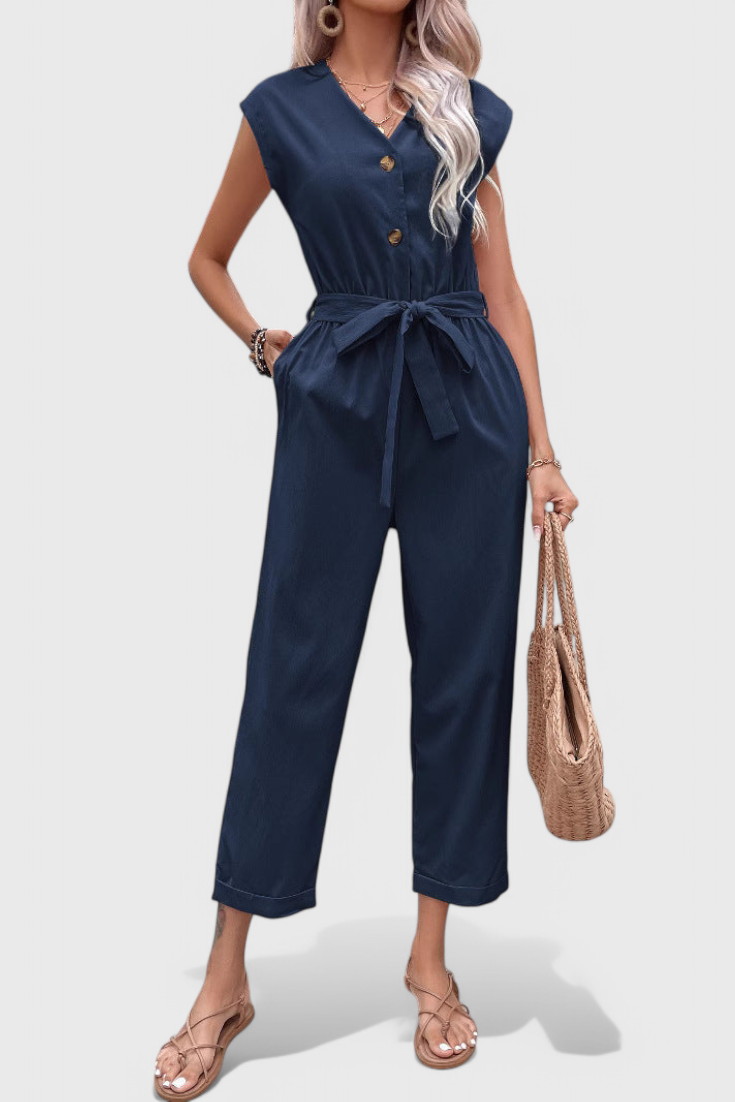 Marie Sleeveless Cotton Jumpsuit with Tied Waist and Button Front