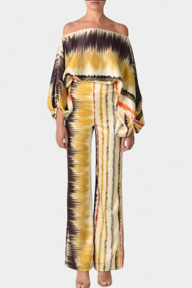 Embrace effortless elegance with the Sybella set, where casual style meets a romantic touch. This stunning ensemble features an off-the-shoulder top with puff sleeves, perfectly paired with wide-leg pants adorned with an artistic print.
