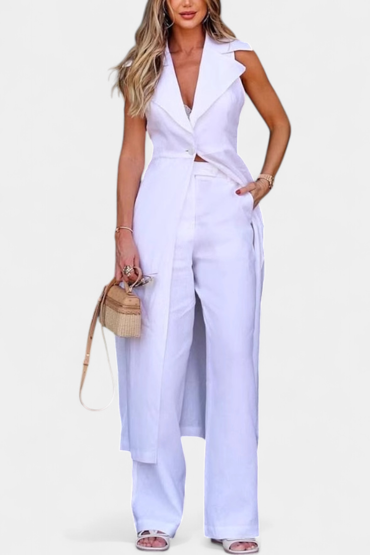 The Eider ensemble redefines summer elegance with its minimalist and sophisticated design. Featuring a long sleeveless vest with structured lapels and a tailored front closure, this outfit is complemented by straight-leg trousers that offer both balance and comfort.