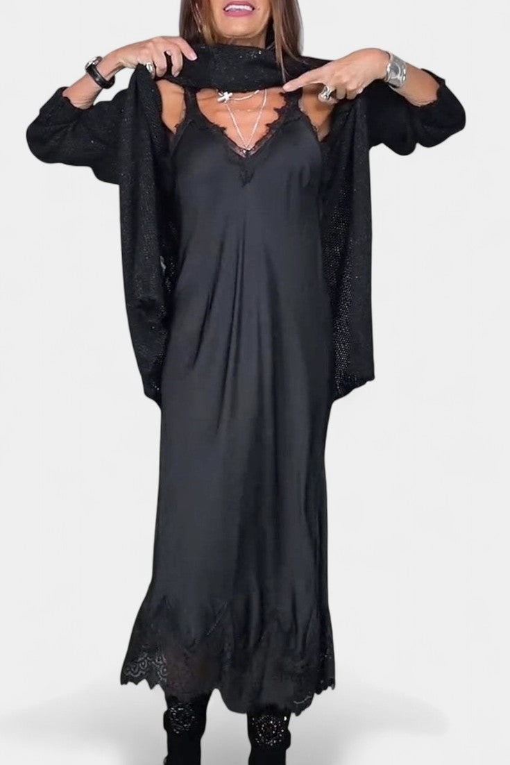 Discover Manola, a stunning two-piece set that embodies discreet grace and fluid modernity. This ensemble features a long, soft knit sweater paired with a flowing dress, creating a beautiful harmony of textures and movement.