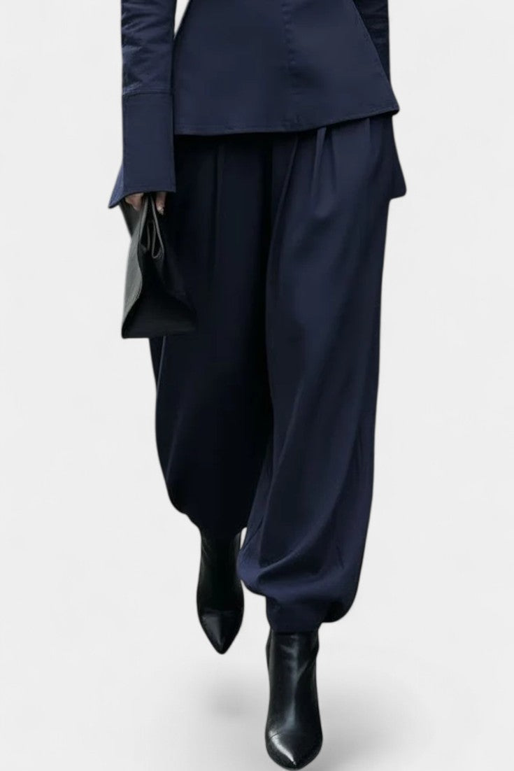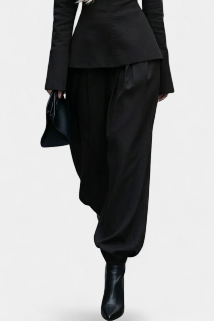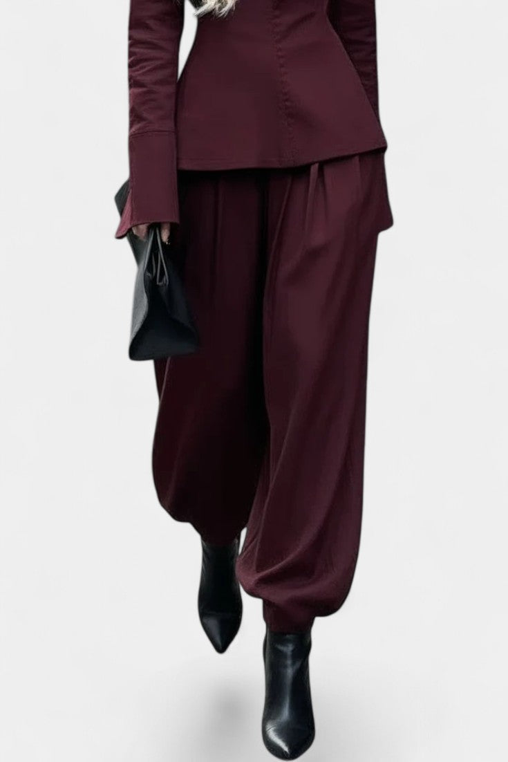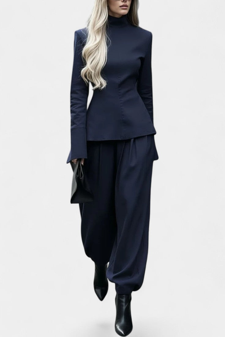Introducing Esmeralda: a characterful ensemble that embodies modern elegance and confidence. This stunning outfit features a fitted jacket with a high collar, expertly structuring the silhouette with architectural precision, paired with flowing wide trousers for graceful movement.