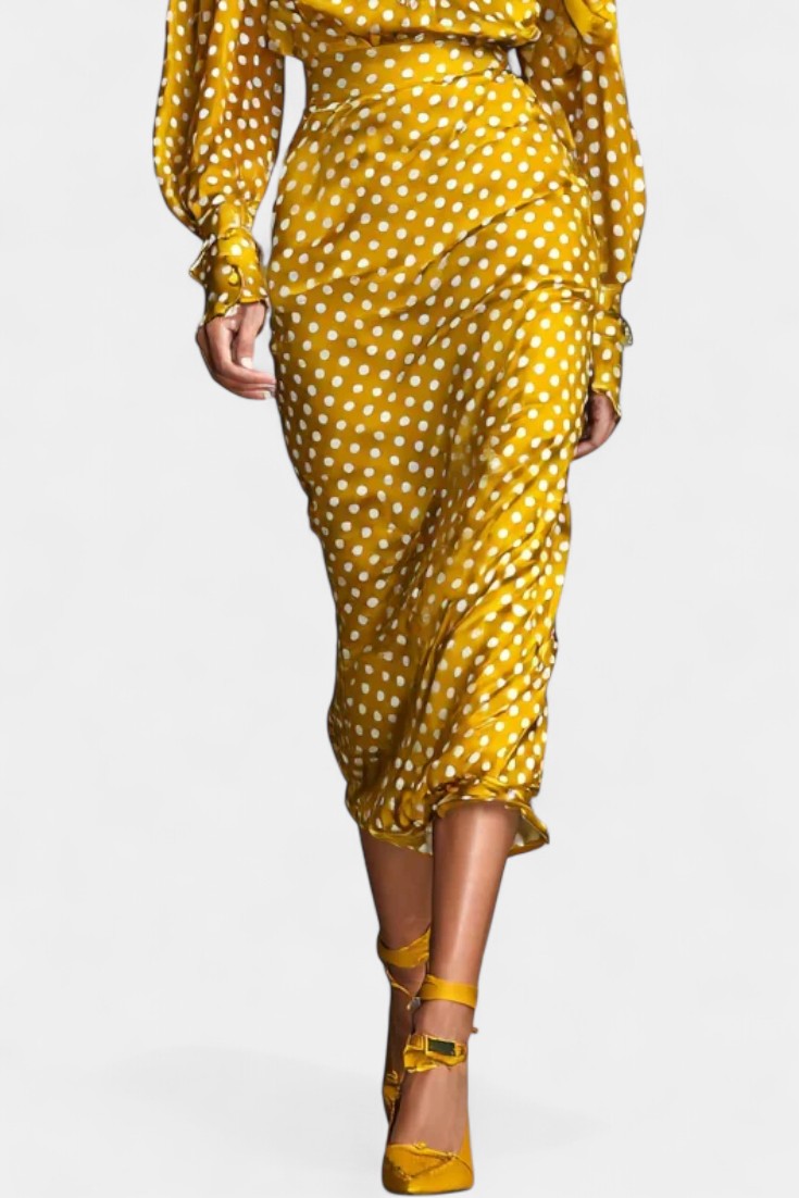 Embrace Retro Elegance with Seranya - a stunning ensemble that fuses vintage charm with modern sophistication. This chic outfit features a fluid satin shirt and a matching midi skirt, both adorned with a reimagined iconic polka dot print.