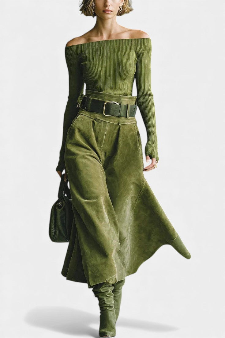 Atala Olive Off-the-Shoulder Top with Midi Suede Skirt Ensemble