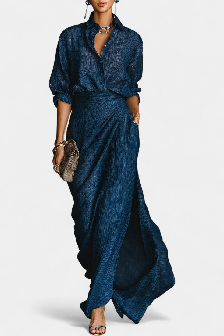 Ziya Dark Blue Outfit Featuring a Light Shirt and Elegant Flowing Maxi Skirt