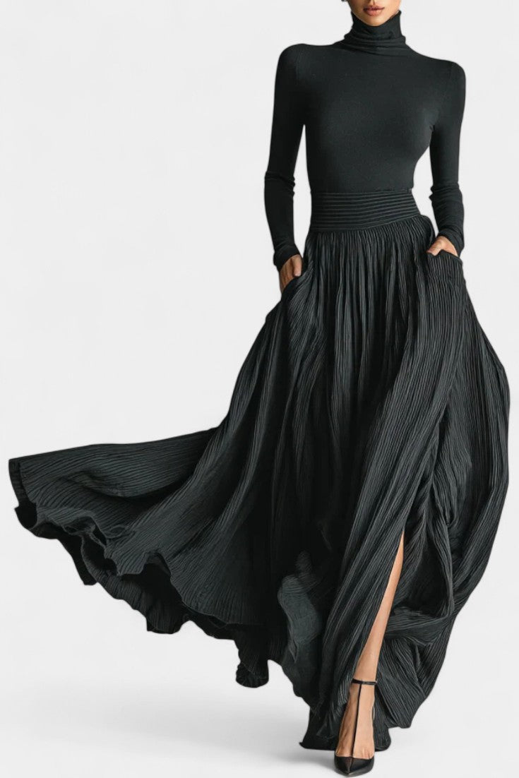 Selara Black High Neck Set with Flowing Pleated Skirt
