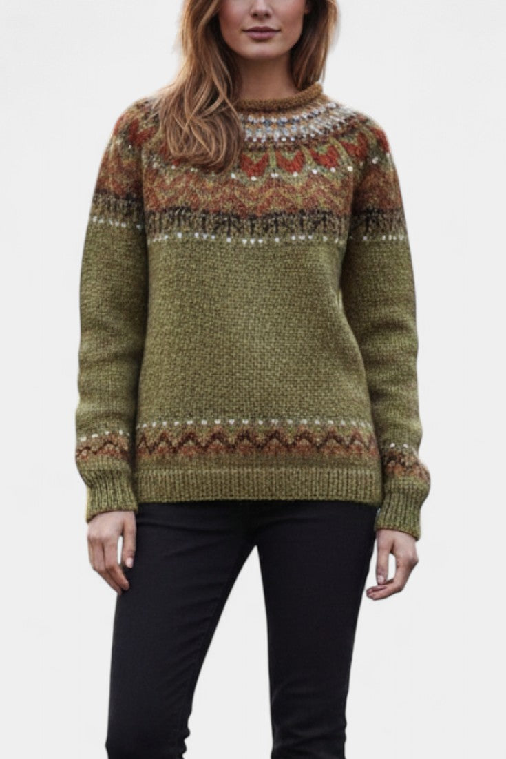 Yanaëlle Sweater combines authenticity and comfort with a Scandinavian knitting-inspired design. Crafted from thick, fluffy knit, this sweater features beautifully crafted jacquard patterns on the upper bust and cuffs.