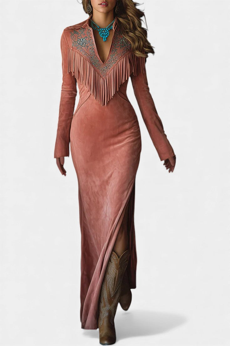 Amber Maxi Dress in Faux Suede with Embroidered Pink Accents and Western Fringes