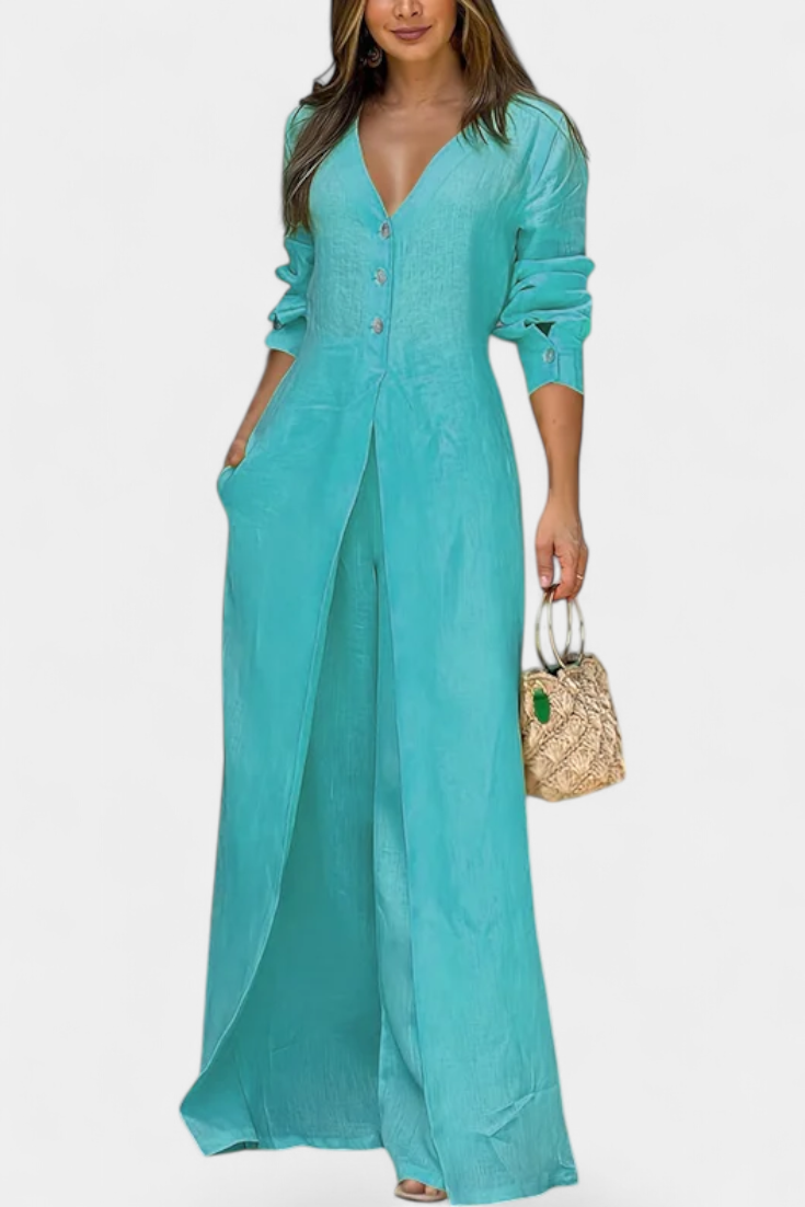 Elevate your wardrobe with the Whitney jumpsuit, where timeless sophistication meets ultimate comfort. This stunning piece features a deep V-neck that adds a feminine touch, while adjustable long sleeves and an elegant front slit create a modern, elongated silhouette.